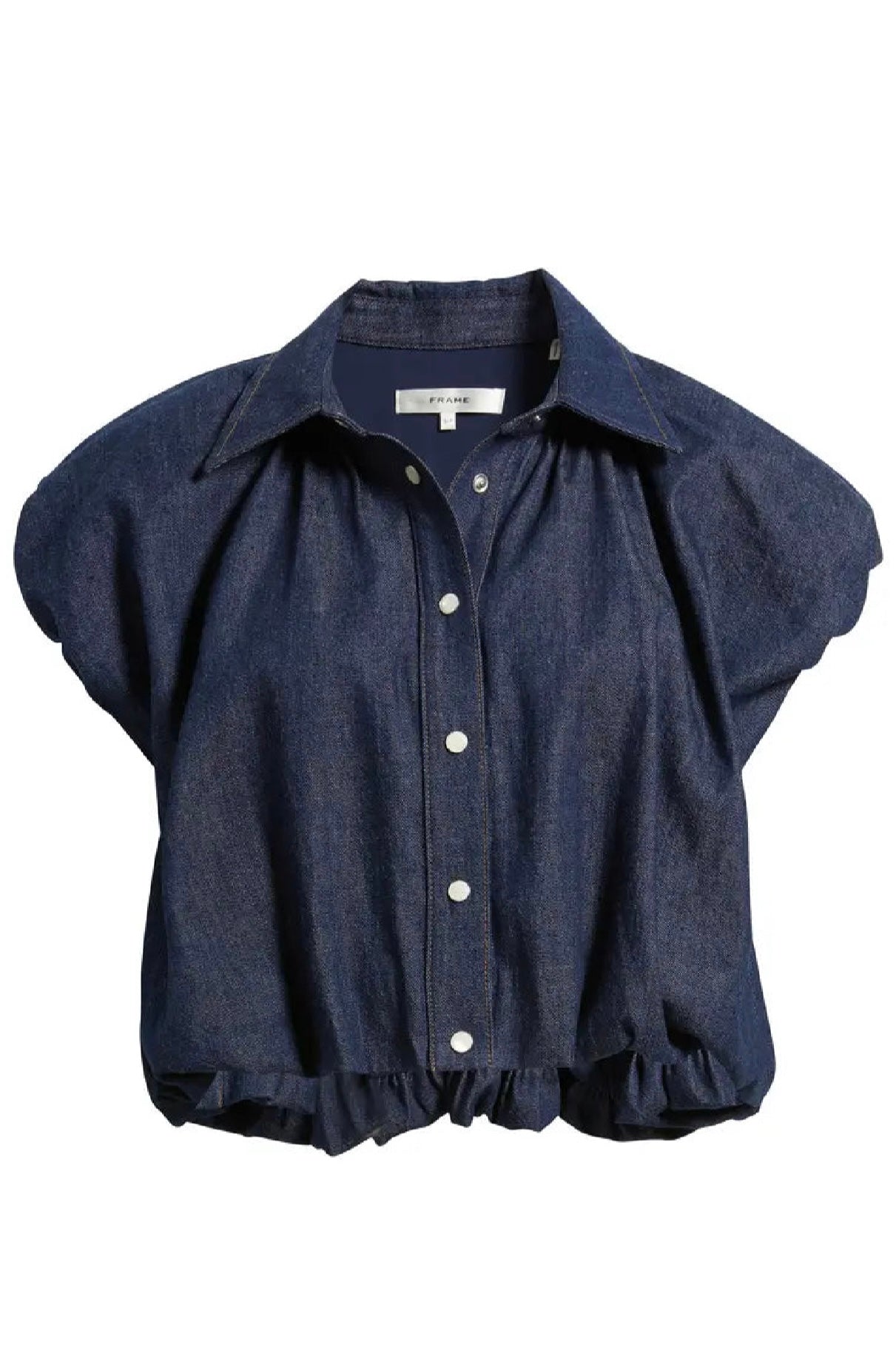 Charming puff sleeves bring subtle volume to this cropped top finished with a bubble waist for a fresh, modern take on classic denim wear.