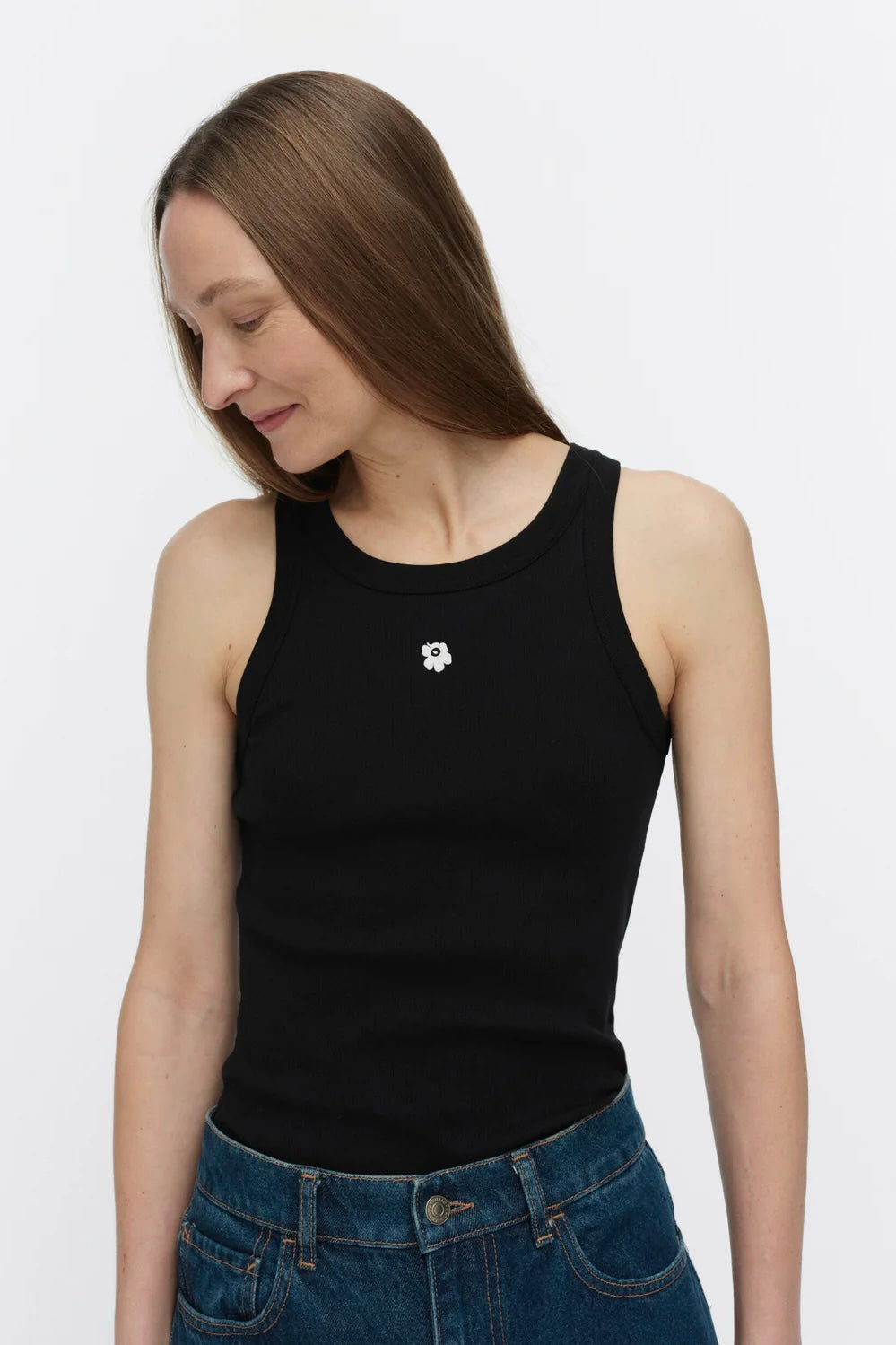 The sleeveless Kedol ribbed tank top is made of organic cotton rib with a slim fit. The product contains 3% elastane. The top has a rib finish at the U-neck and sleeve openings. The small Unikko flower is embroidered in the front.