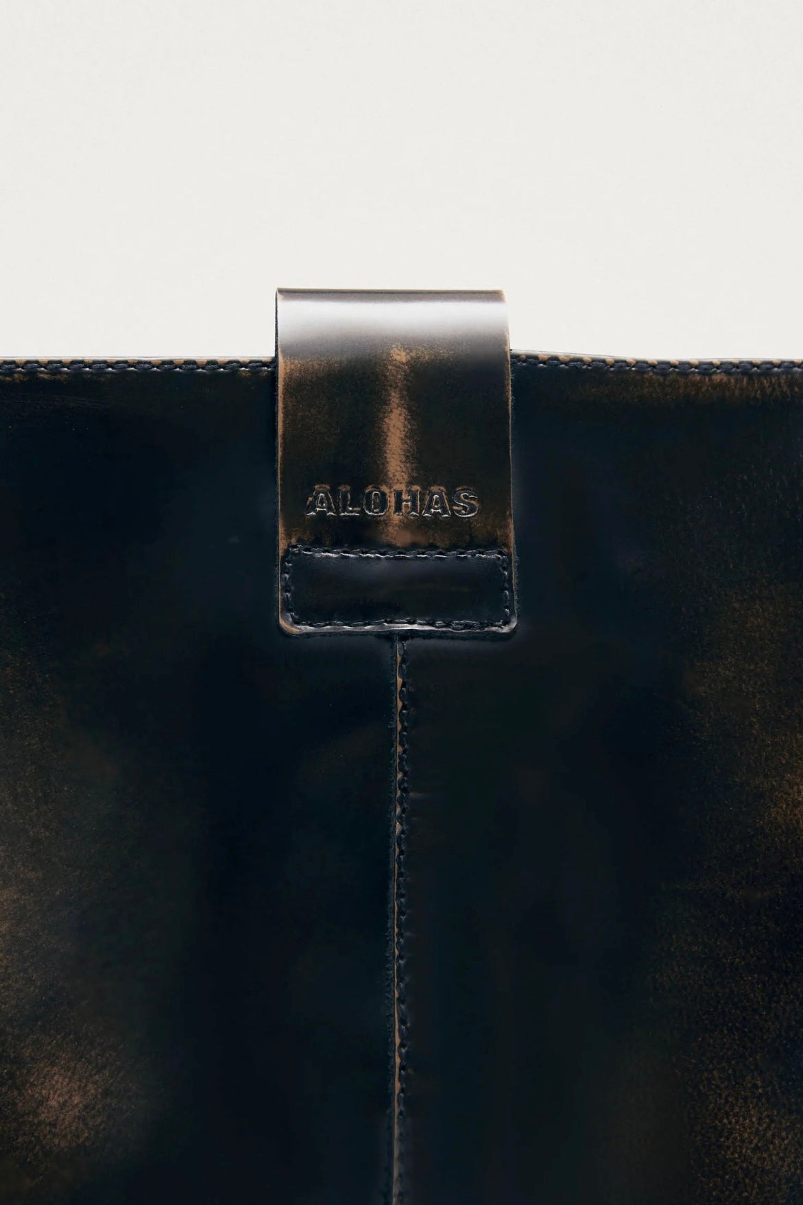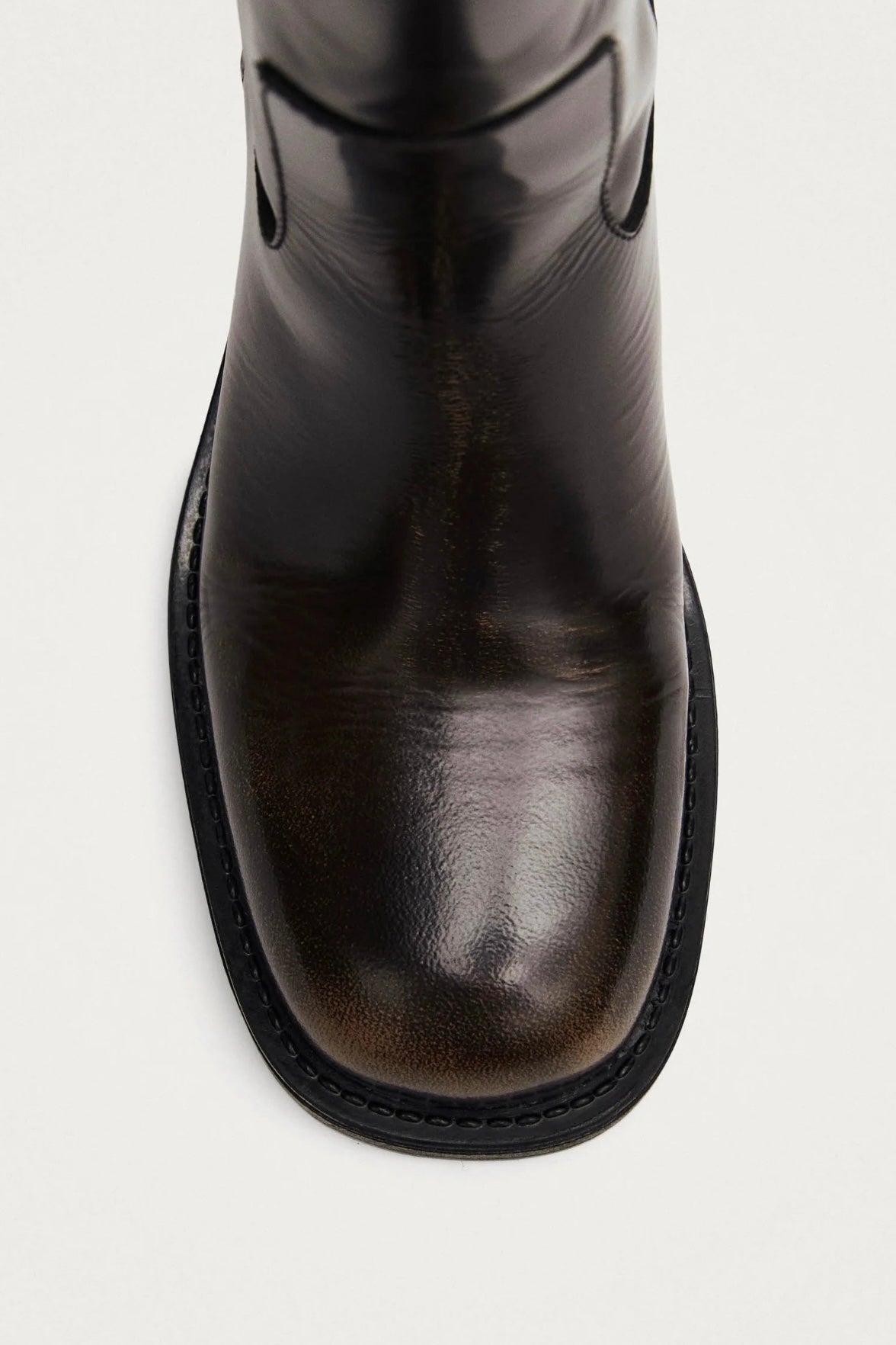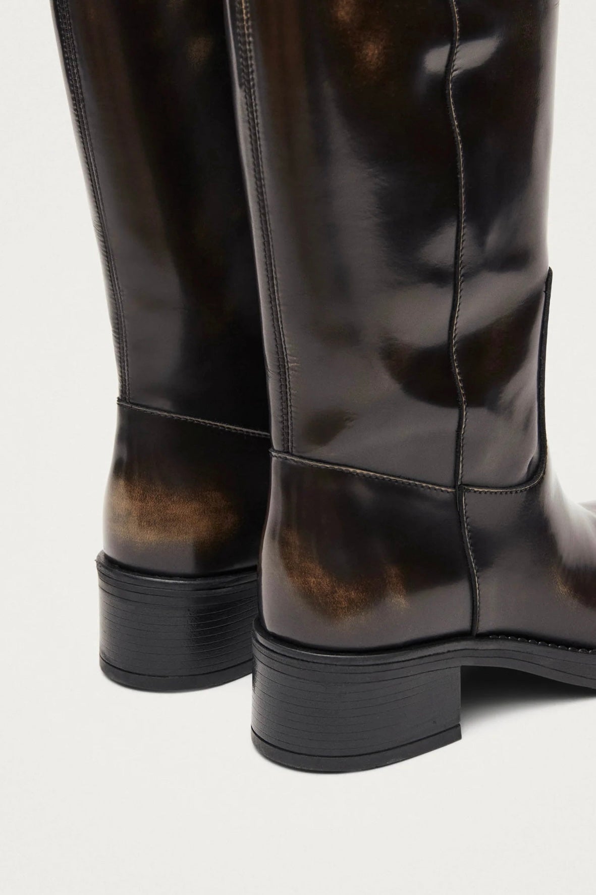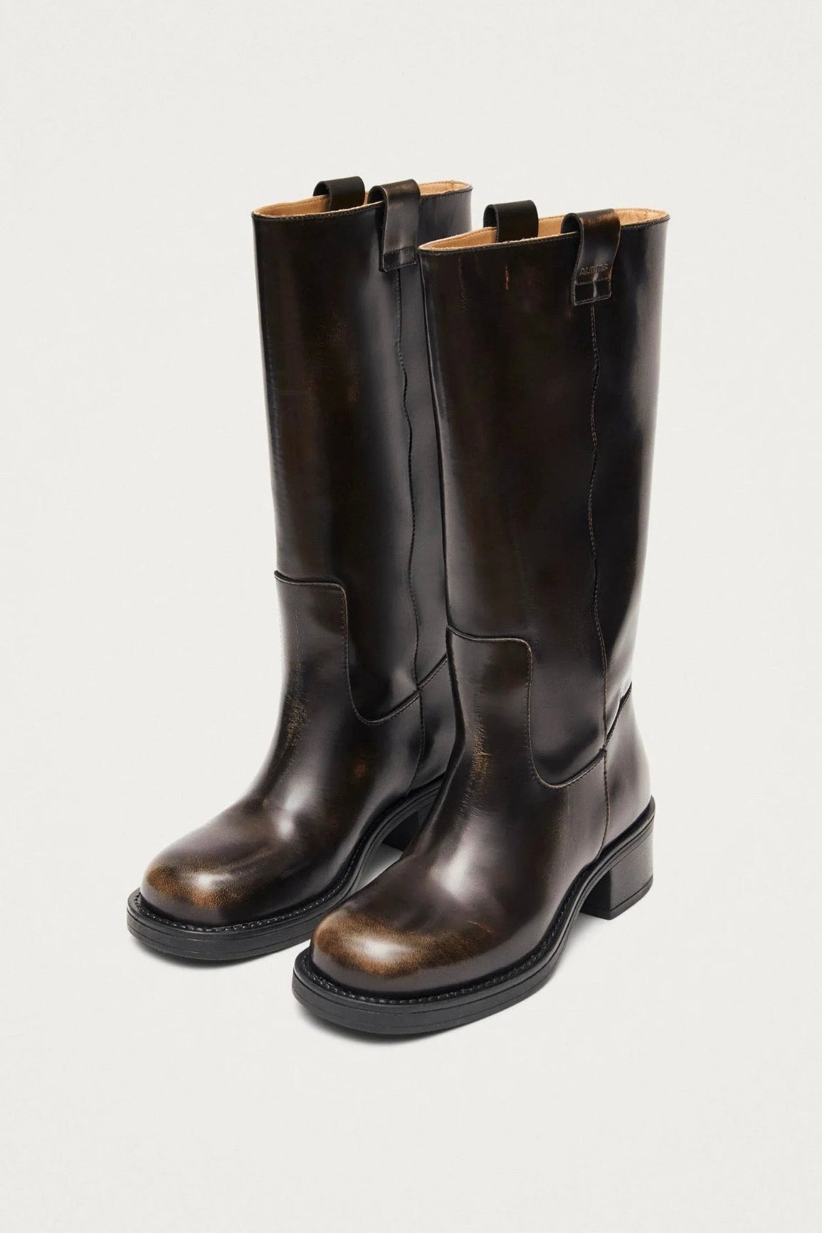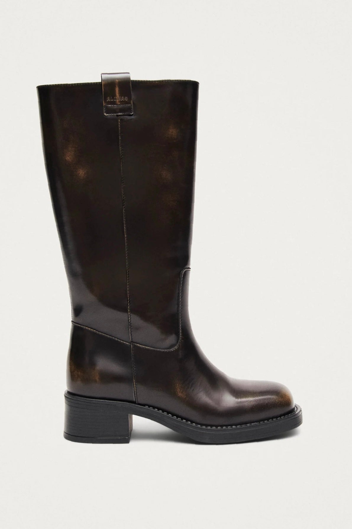 Modeled on traditional riding boots, this style plays with chunkier proportions. It’s crafted from distressed brown leather into a structured calf-length silhouette, featuring rounded toes and raised rubber soles. The pull tabs at each side help to get them on with ease.