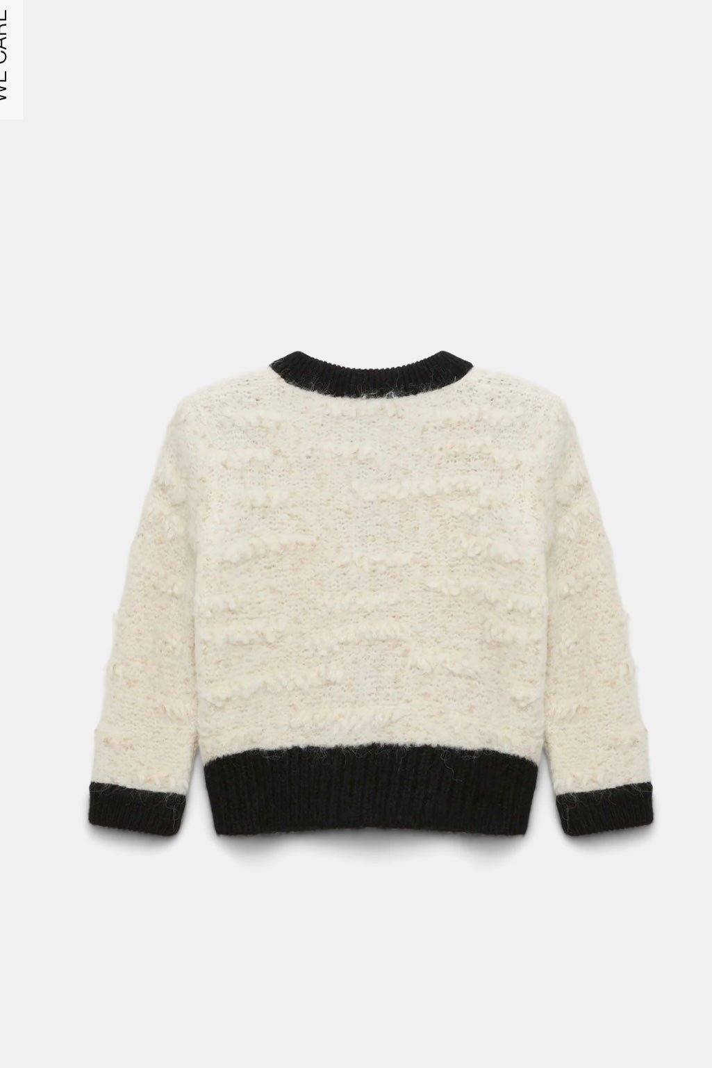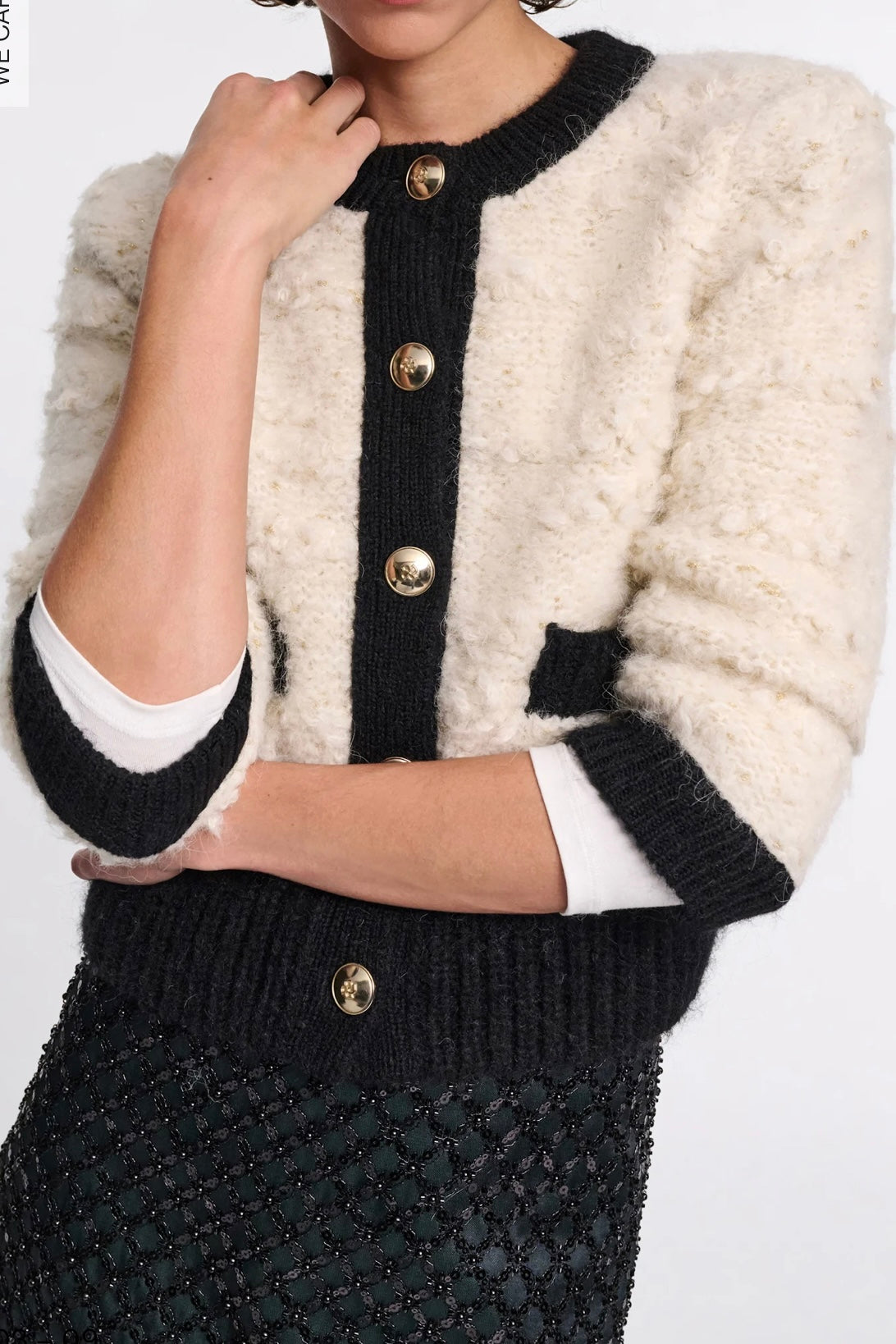 The two-tone cardigan is knit in an alpaca-infused mix with Lurex shimmer and solid Merino wool. The boxy style has a boucle-like feel and golden D-rose buttons.
