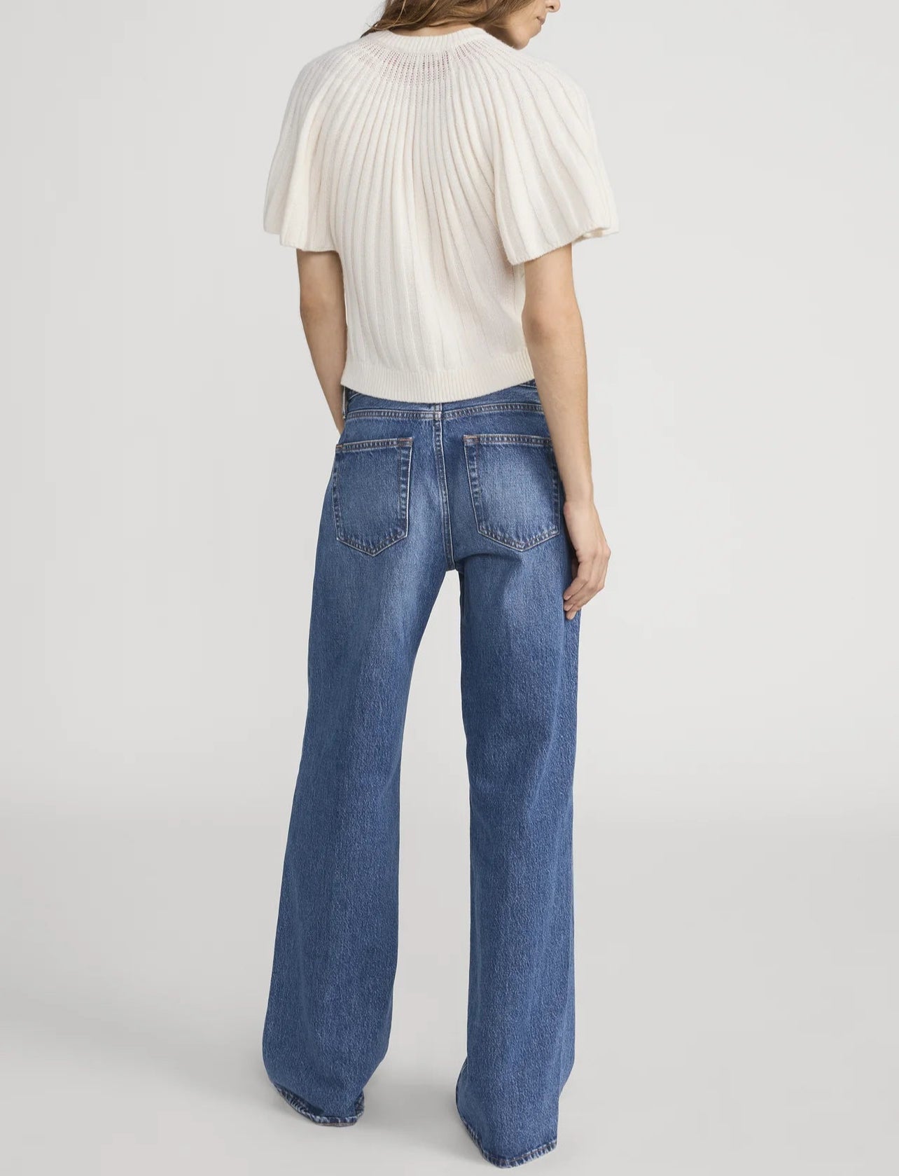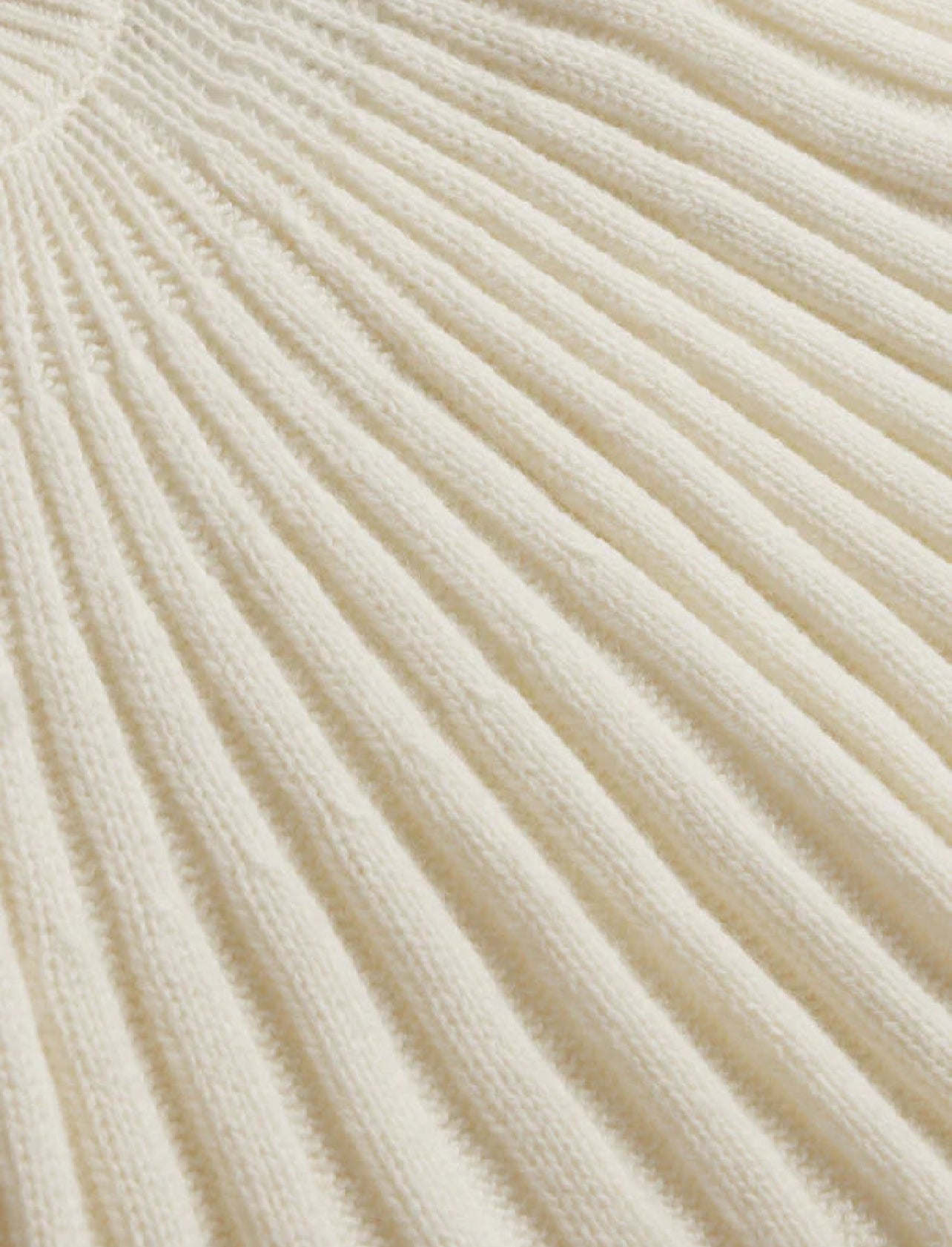 The Flutter Cardigan is crafted from a luxe wool-cashmere blend with a loose rib knit, featuring flutter sleeves and gold knot buttons—designed to be worn as a top or layered as a cardigan.