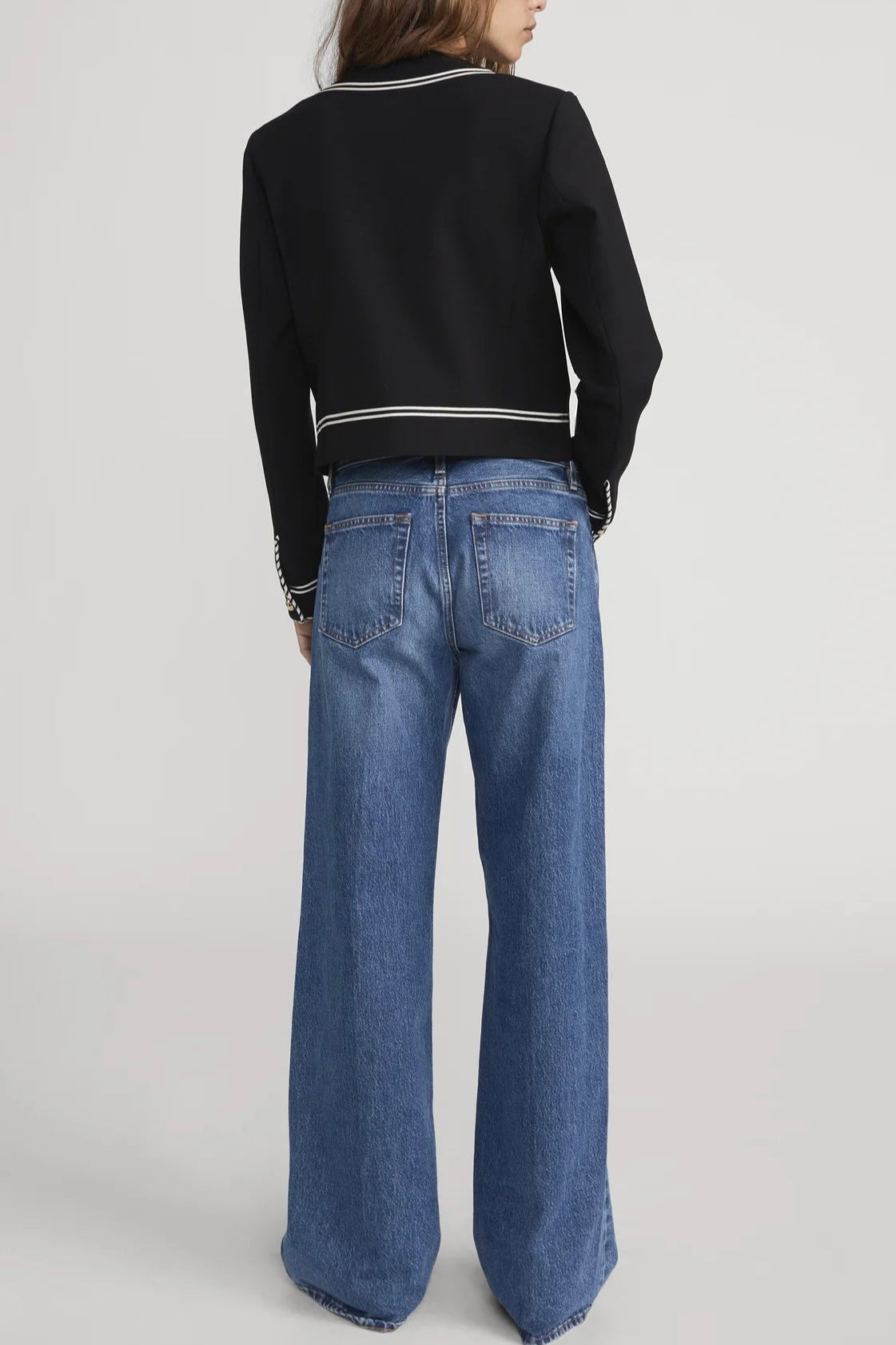 The Prim Jacket is crafted with contrast piping, novelty gold knot buttons, and functional front pockets, featuring a clean, cropped silhouette that pairs effortlessly with mid-rise denim or the matching Prim Slim Palazzo for a full look.