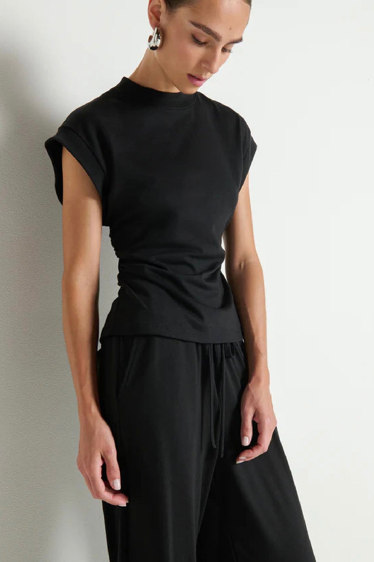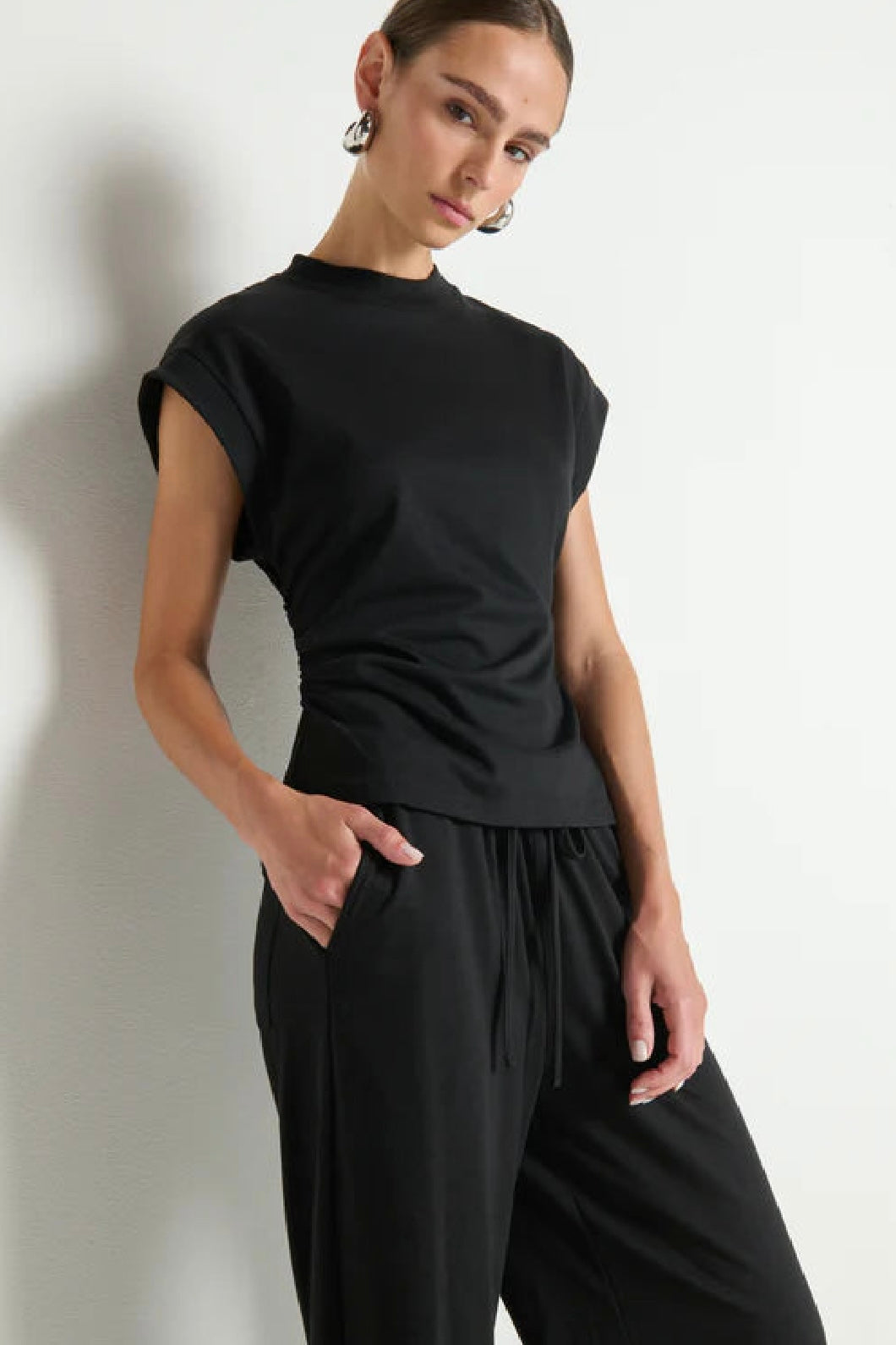 A study in balance. The Andrea Side Shirred Top is equal parts edge and softness, with a heavyweight knit that drapes with intention, and side shirring that adds subtle shape and movement..