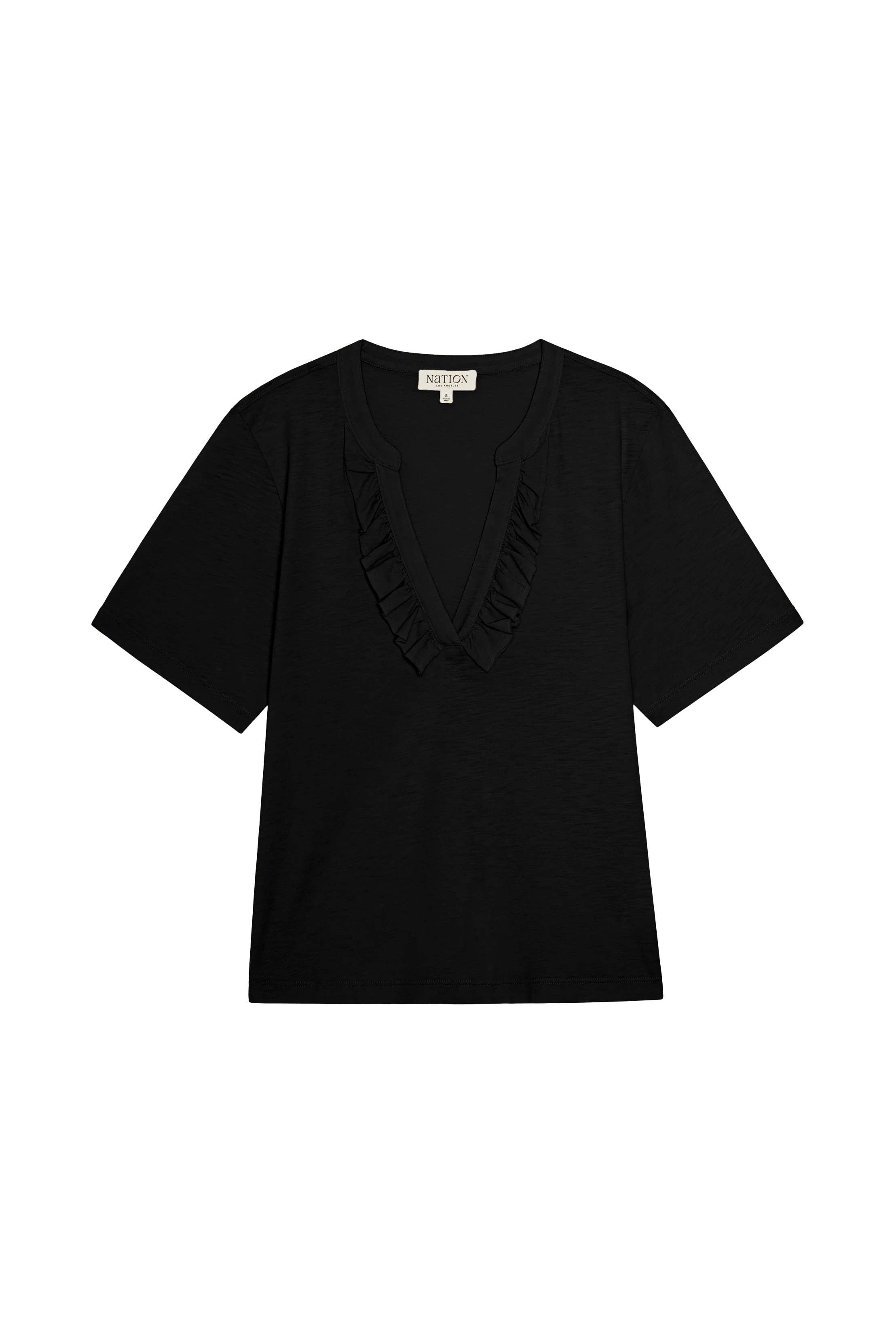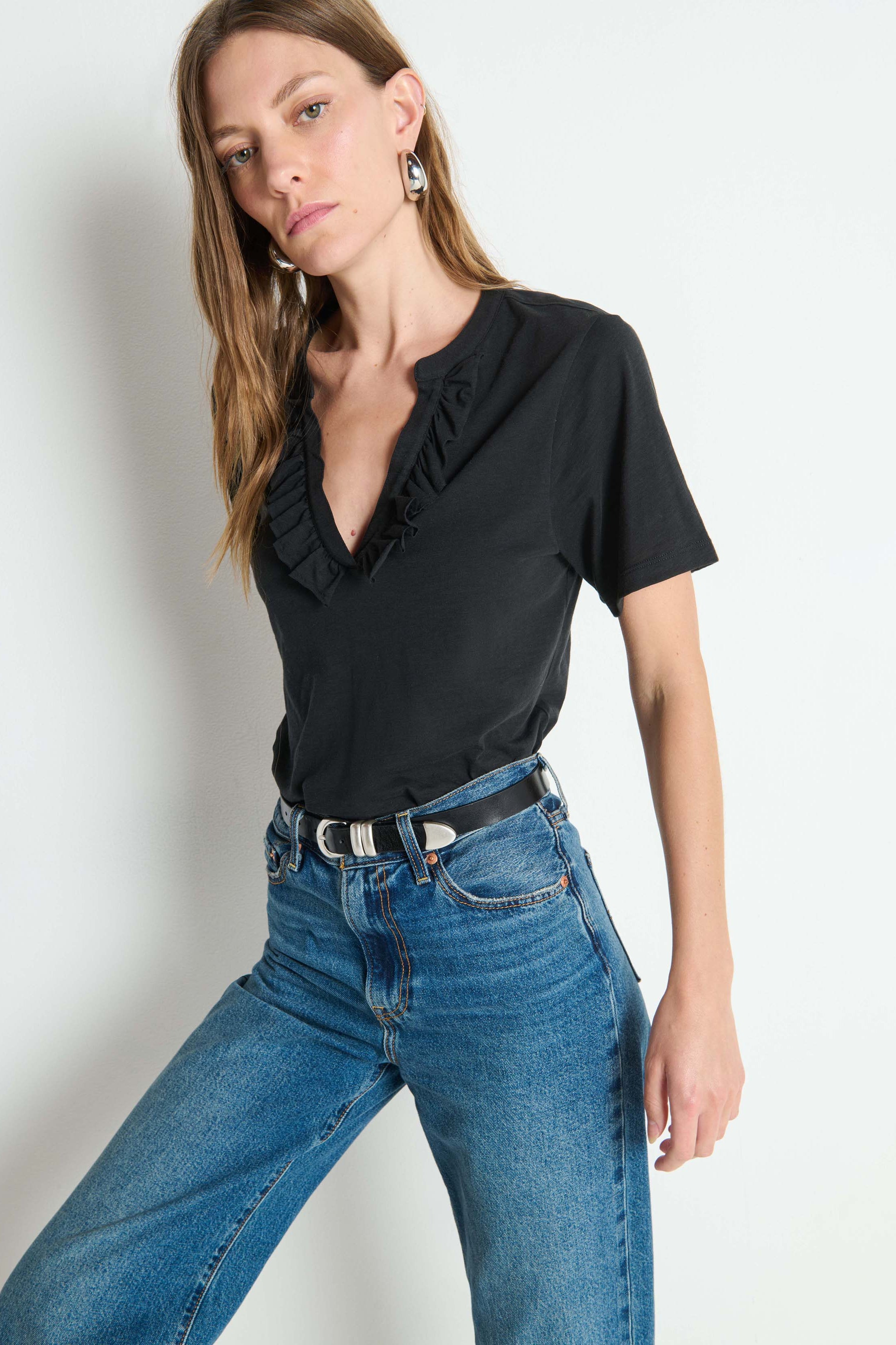 Easy, confident. Made from 100% pima cotton, this deep V neck is framed by a ruffled neckline and raw edge.