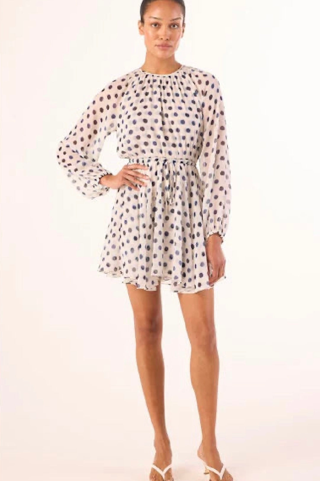 The Anthea Dress is a timeless mini, cut from a lovely Midnight Lattice printed chiffon. It features a high gathered neckline, long raglan blouson sleeves, and a keyhole button-back closure. An adjustable cinch-tie waist flatters the figure while flowing into a softly draped skirt. Fully double-lined for effortless wear, this style pairs perfectly with suede boots for a polished transitional look.