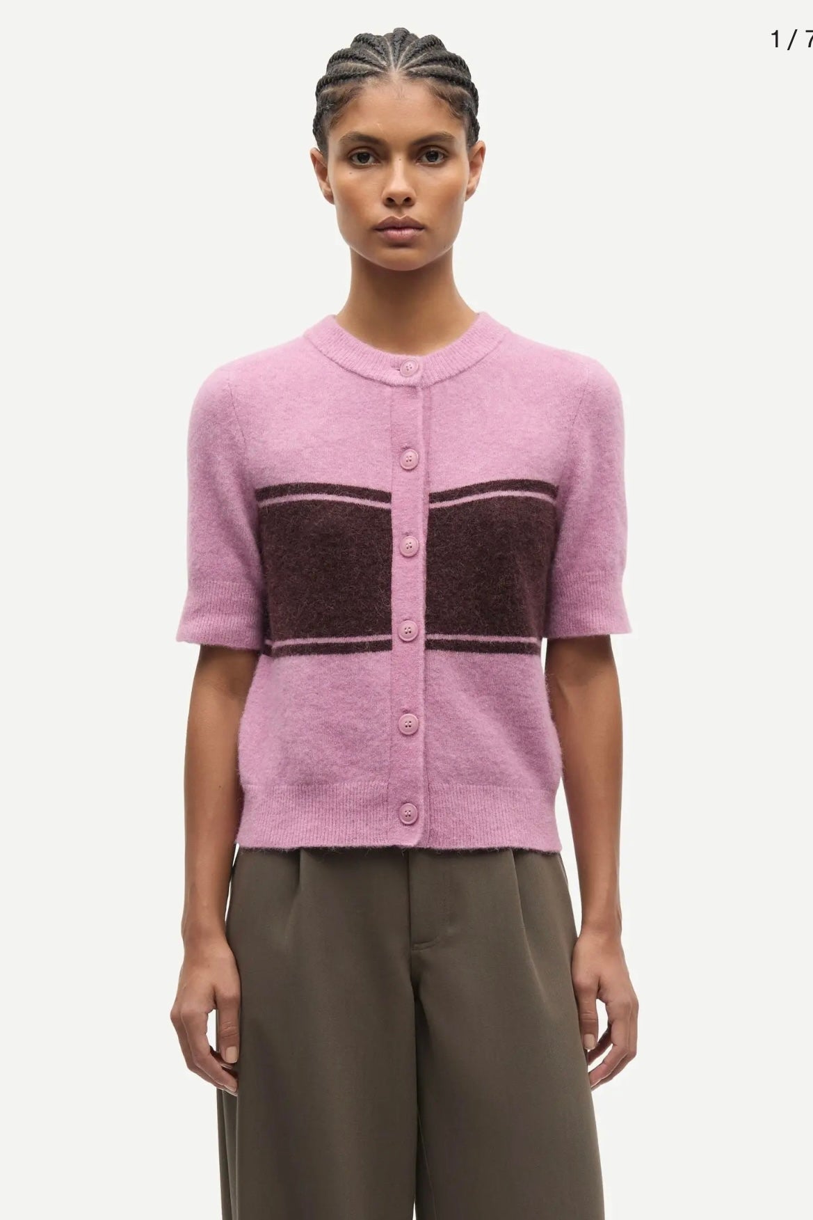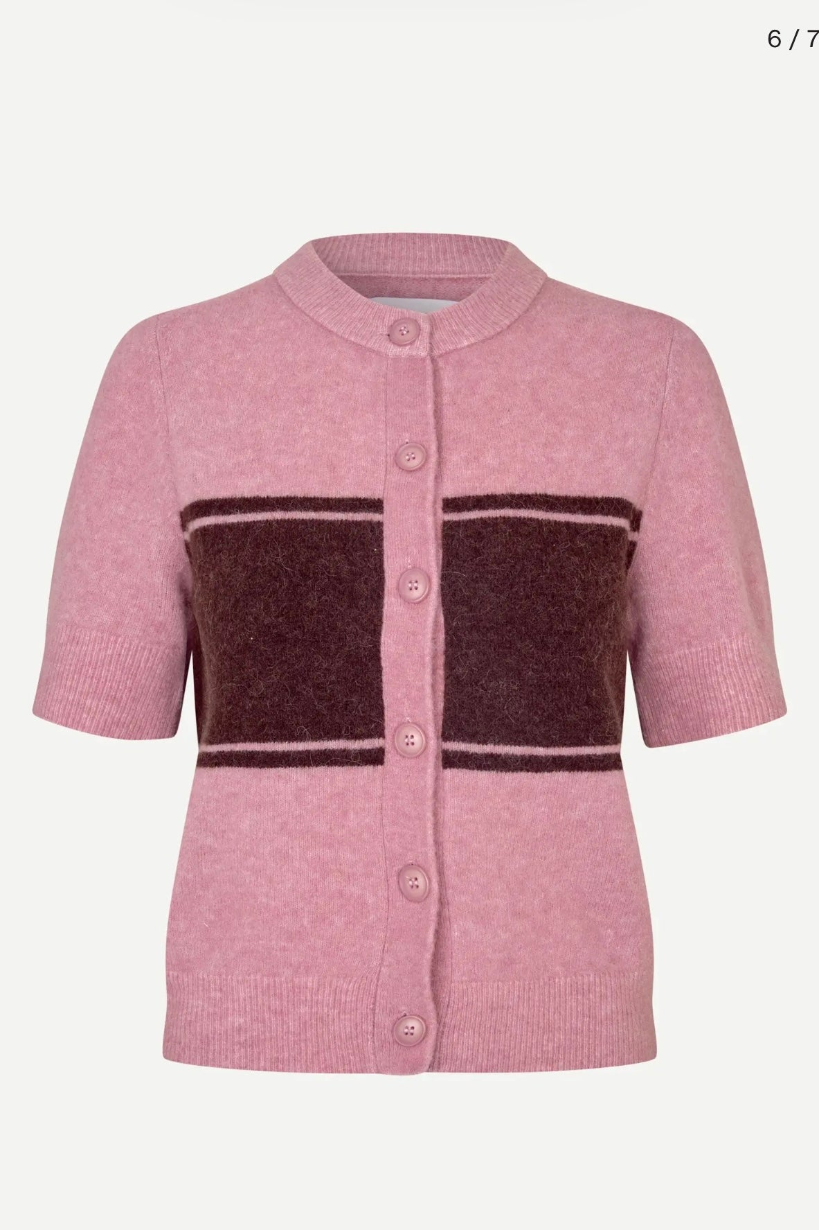 Short-sleeved cardigan with a regular fit. Button closure on the front. Rib-knitted collar, cuffs, and hem. Round neck. Main material made from an elastic blend of wool, alpaca wool, and recycled polyester.