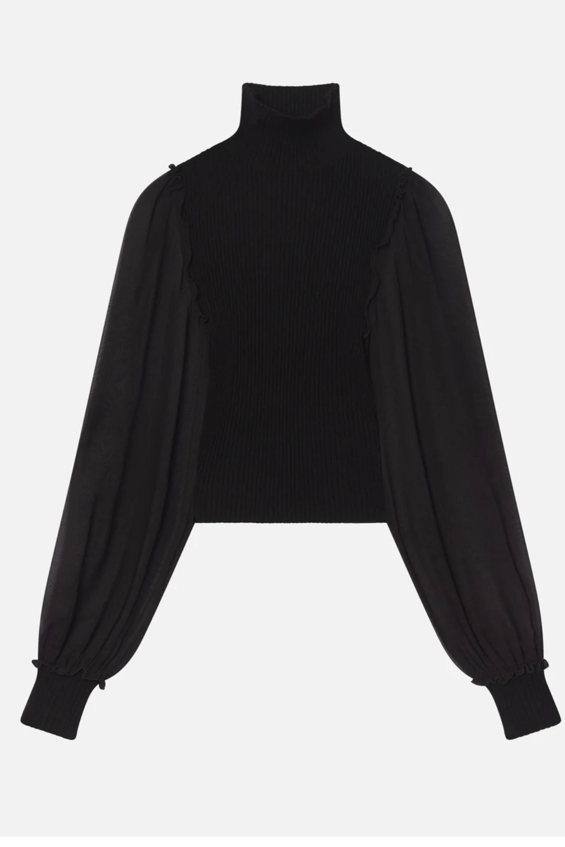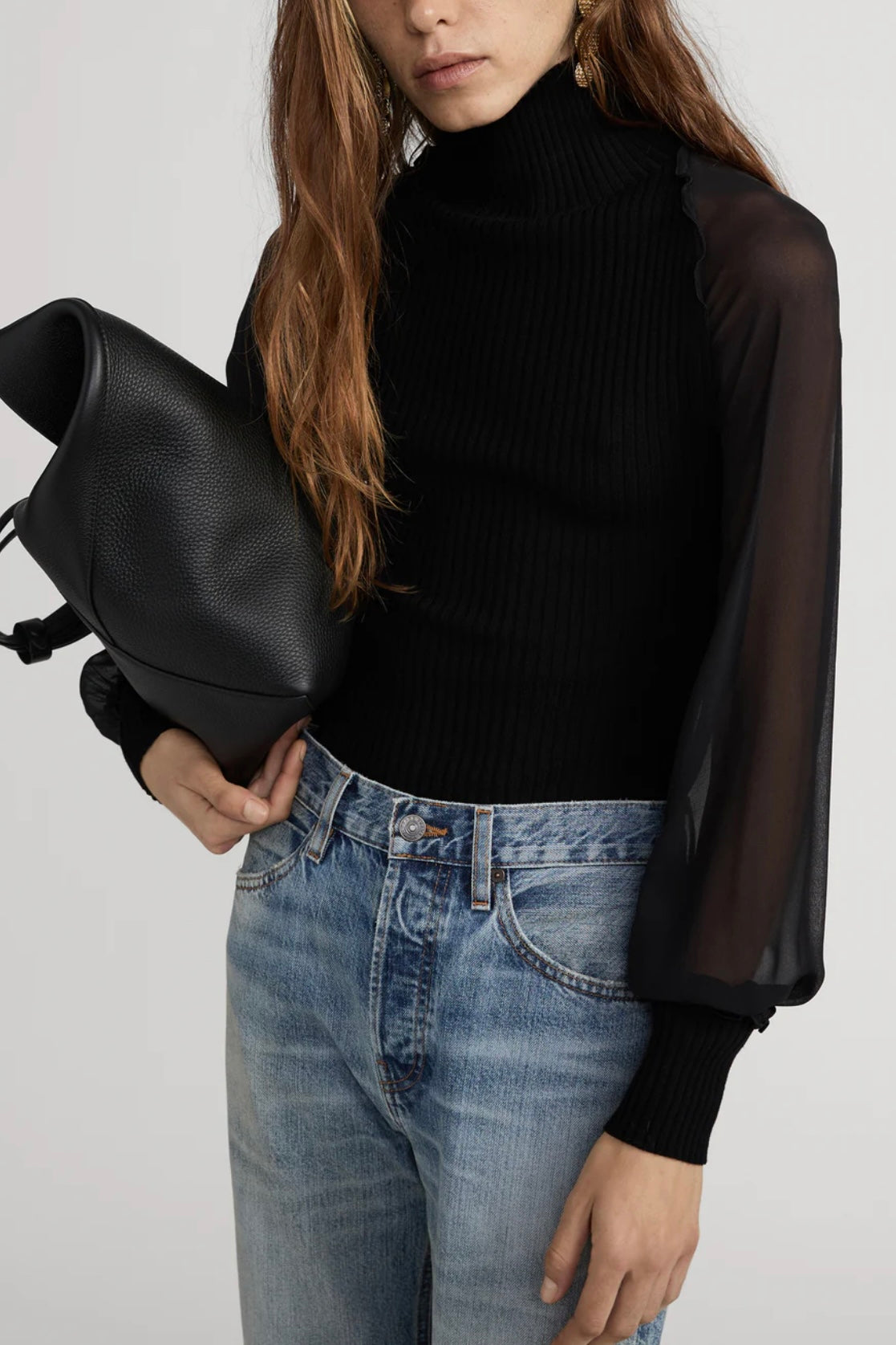 A modern take on the classic LBD, The Sheer Sleeve Dress is a rich interplay of texture and volume. This high-neck silhouette features a rib-knit body and cuffs, sheer silk sleeves and a silk bubble hem.