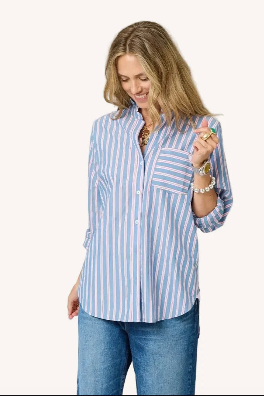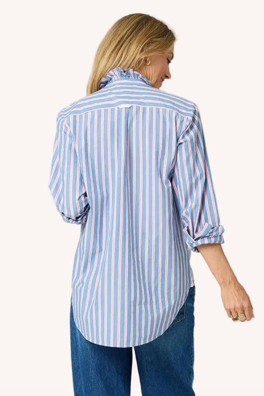 The Mia Ruffle Stripe Shirt in crisp cotton with a delicate ruffle collar that feels both playful and quietly polished. Wear it buttoned all the way up or left open just enough. Tuck it, layer it, live in it, sleep in it.