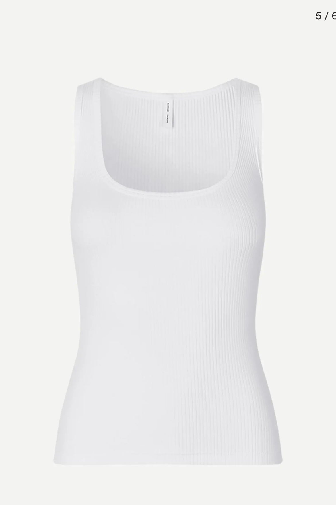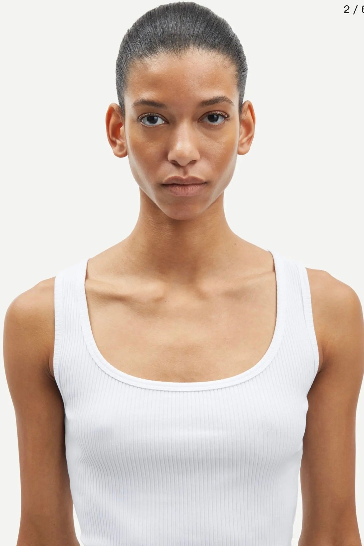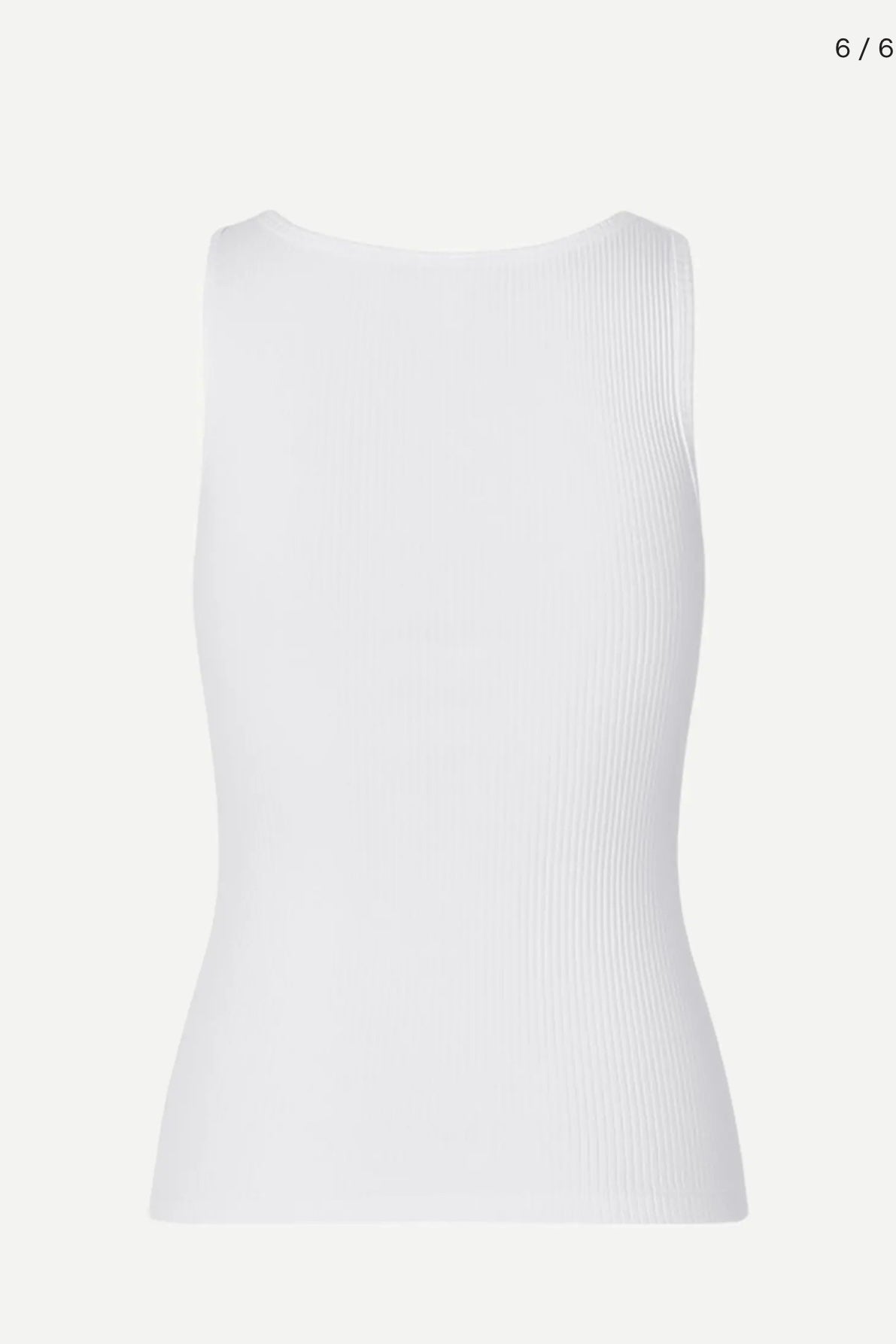 Slim fitting jersey vest top with a wide scooped front neckline and a high back neck. Ribbed jersey fabric, organic cotton and stretch Elastane blend.