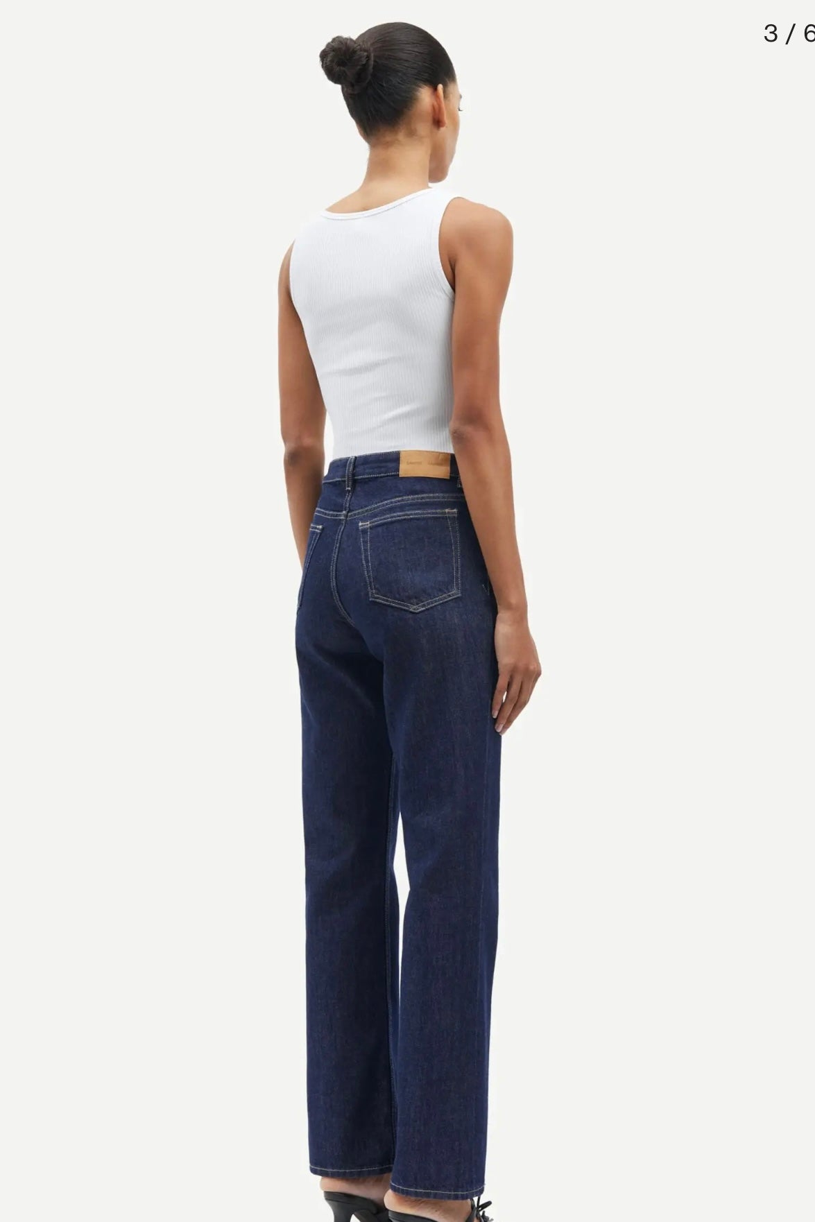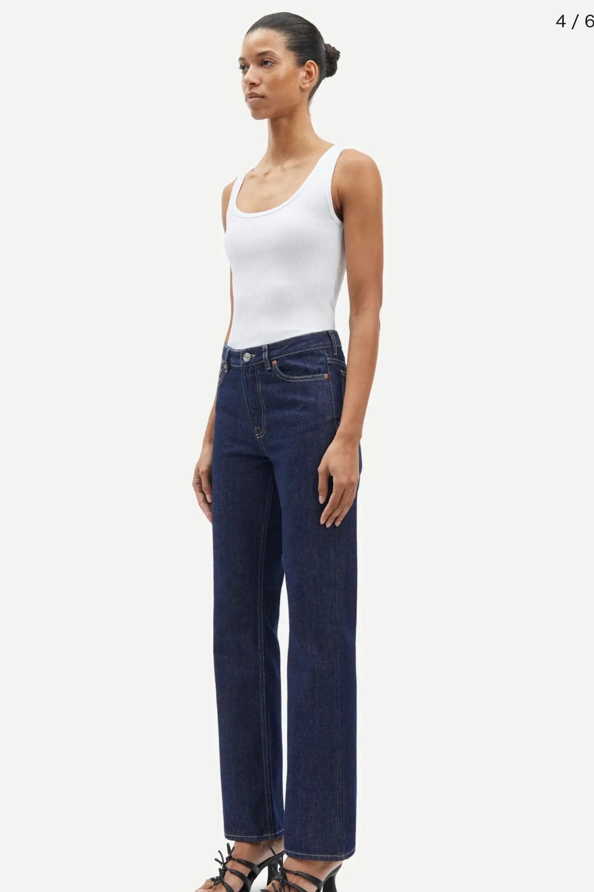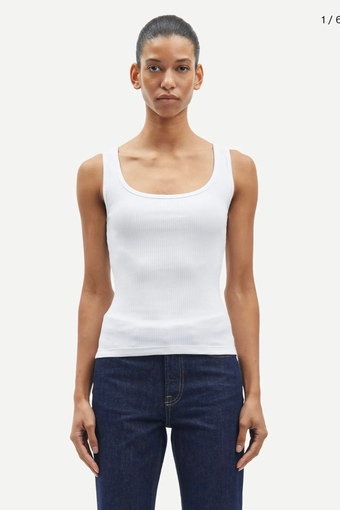 Slim fitting jersey vest top with a wide scooped front neckline and a high back neck. Ribbed jersey fabric, organic cotton and stretch Elastane blend.