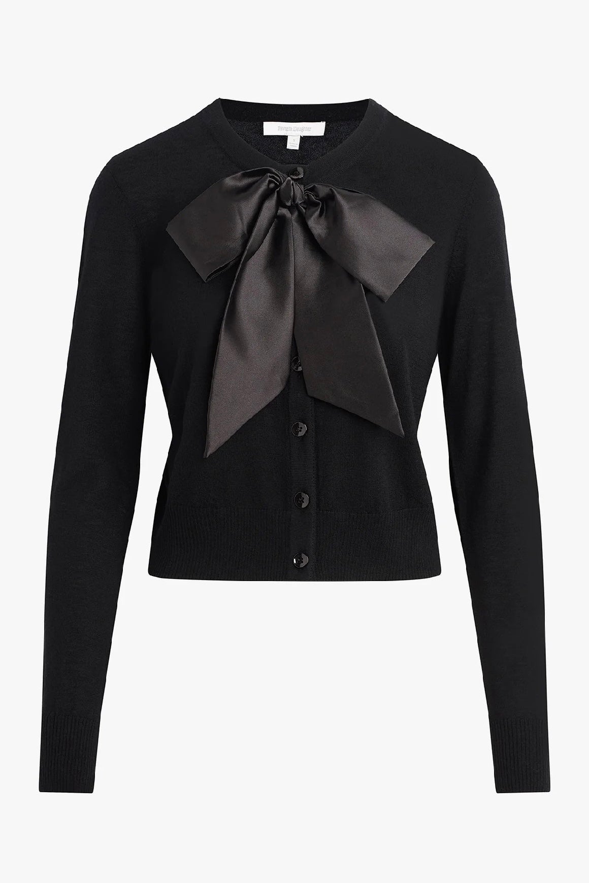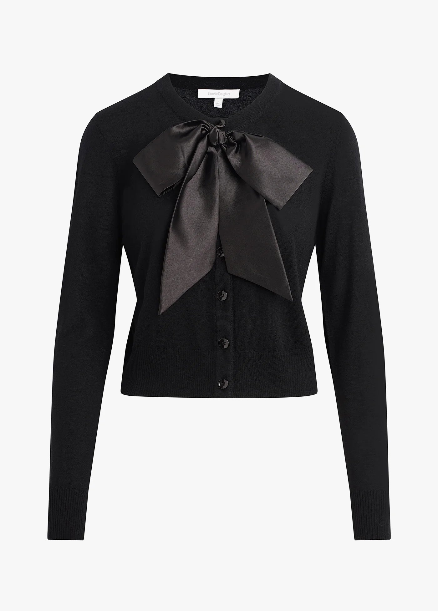 The Take A Bow Cardigan earns its applause. Our slim-fit cardi, cut from soft merino wool, is finished with satin buttons and a detachable satin bow that can be tied through the top button hole. Proof that classics can still steal the show.